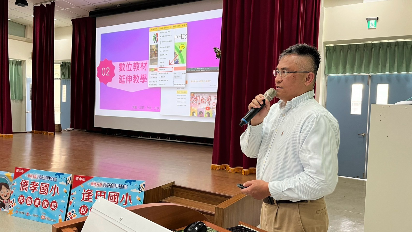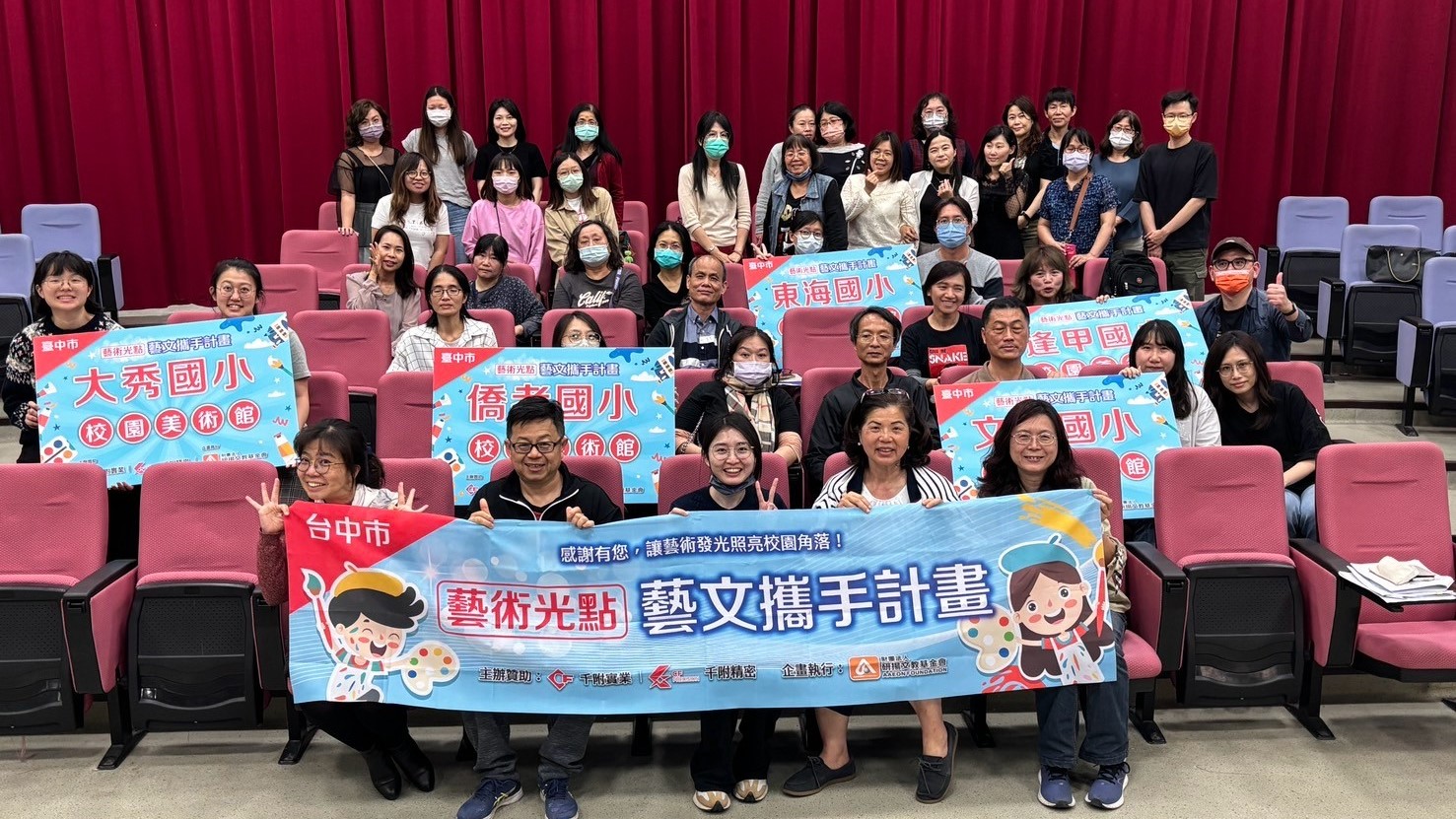 由千附集團贊助,研揚文教基金會共同推動之2025臺中市藝術光點-藝文攜手計畫,於3月12日下午假台中市僑孝國小進行「台灣藝術家主題巡迴展-藝術賞析數位化教材運用」教師研習,本次計畫5所學校(僑孝、逢甲、文雅、大秀及東海國小),共40位教師參與研習,活動邀請沙鹿國小吳仁欽主任與外埔國小邱碧惠主任前來分享執行經驗成果,期許透過研習讓在座老師瞭解計畫推動之技巧及細節。 沙鹿國小吳仁欽主任率先透過簡報,完整分享計畫詳細執行方式,從佈展到數位教材使用,透過齊柏林主題分享延伸的教學活動讓學生攝影創作,並藉由家鄉地圖的活動讓學生實地踏查後,小組製作簡報,並搭配房仲之呈現方式,加深孩子們對於土地的情感連結,最後以見學甄選辦法與回校分享作結,期勉透過攜手計畫讓師生都能共同提升美的涵養及對於家鄉之認同感! 而外埔國小邱碧惠主任也完整介紹了學校整年度執行計畫的狀況,各處室全員動起來並委派老師協助訓練小小導覽員,透過五輪的輪展訓練,學童表達能力驚人的進步,讓家長跟主任都深深被感動,其中家鄉地圖競賽成果更是被大台中新聞主動找上採訪,孩子們的進步能夠被看見、被肯定,讓主任回饋雖然辛苦,但是真的是非常棒的資源。最後以「一個人可以走得很快,一群人卻可以走得很遠」感謝基金會與贊助企業千附集團能給學校這麼好的機會作結。 基金會則分享由台中市仁美國小謝婉妮老師設計的主題展數位教材之重點,讓老師們了解計畫架構及各主題之重點能夠搭配不同主題發揮創意,進而設計出創新的延伸教學活動。 「2025臺中市藝術光點-藝文攜手計畫」期以資源整合方式,將「藝想台灣─台灣藝術家校園巡迴展」、「e-School藝術賞析數位化教材」、「臺北藝術探索見學之旅」、「家鄉地圖繪製─競賽活動」四大主題活動,將藝術資源帶到學校與社區,讓美感教育融入教學及生活。