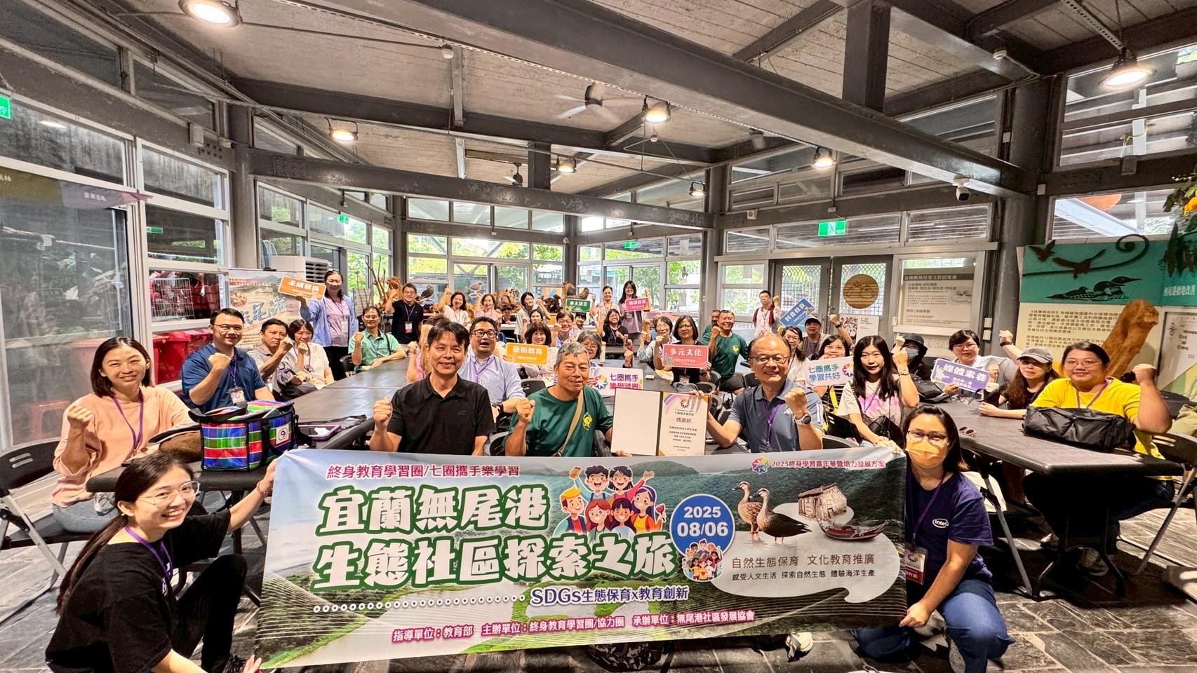 教育部今年度「終身學習」串聯永續發展、科普、閱讀及藝術教育、多元文化及家庭教育、本土語言及媒體素養共7大學習主題,今年由研揚文教基金會主辦協力圈參訪活動,集結七圈圈長共27家NPO夥伴一同進行跨領域交流學習。 此次參訪活動以「無尾港生態社區探索之旅」為主題,首站位於無尾港解說中心,首先透過宜蘭縣無尾港文教促進會影片及專業導覽初步認識濕地生態與保育故事,接著,夥伴們著青蛙裝親身體驗移除外來種植物,透過撈網的實作中理解維護生態平衡的重要。 中午享用宜蘭特色割稻飯後,下午進行「創玩植物染」,以薑黃為天然染料學習友善環境的染布技法,人人皆完成獨一無二的手作布品。隨後參訪岳明國中小,黃建榮校長分享永續創新海洋教育的實踐經驗,展示地方學校如何結合環境教育與社區資源培育下一代。 稍作點心休息後,夥伴們體驗傳統「陸上牽罟」的活動,在宜蘭縣無尾港文教促進會梁智雄總幹事的指導下,學習古老捕魚智慧,感受漁民的智慧。最後於解說中心,透過精心剪輯的影片,回顧一整天從濕地保育到海岸文化的深度學習。 本計畫以行動實踐環境教育與地方連結,從濕地保護到永續染布、再到漁民智慧,展現跨領域的終身學習精神。透過親身體驗與交流,夥伴們不僅收穫知識,更凝聚共同守護環境、促進社區共好的理念,為後續跨界合作奠下良好基礎。 感謝七圈圈長:技嘉教育基金會、何嘉仁文教基金會、鄭福田文教基金會、金車文教基金會、耕莘文教基金會、愛心第二春文教基金會及研揚文教基金會領頭,集結全臺非營利組織共同參與,透過舉辦跨領域及多元主題的學習交流活動,讓七圈夥伴在短暫的一天內心靈豐碩,期盼後續有更多NPO夥伴一起加入「協力圏」,一同學習邁向共好!